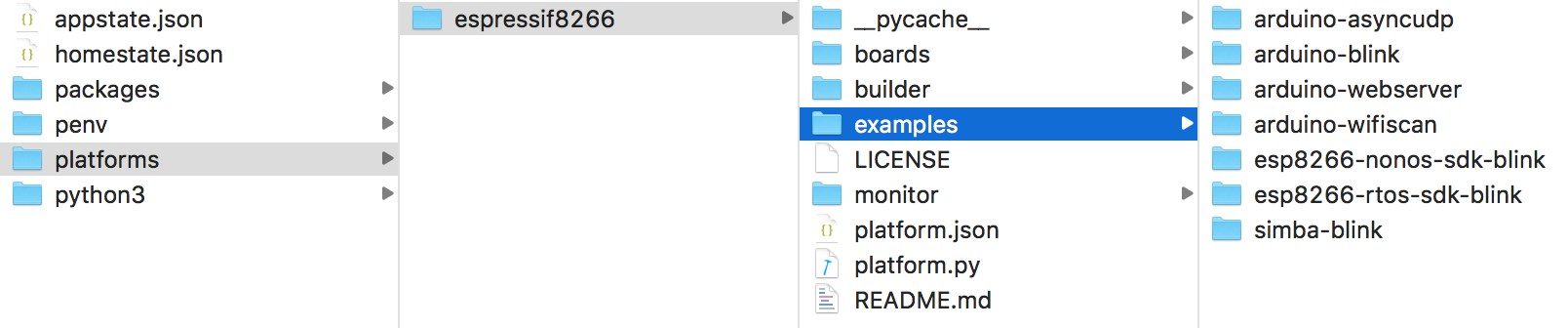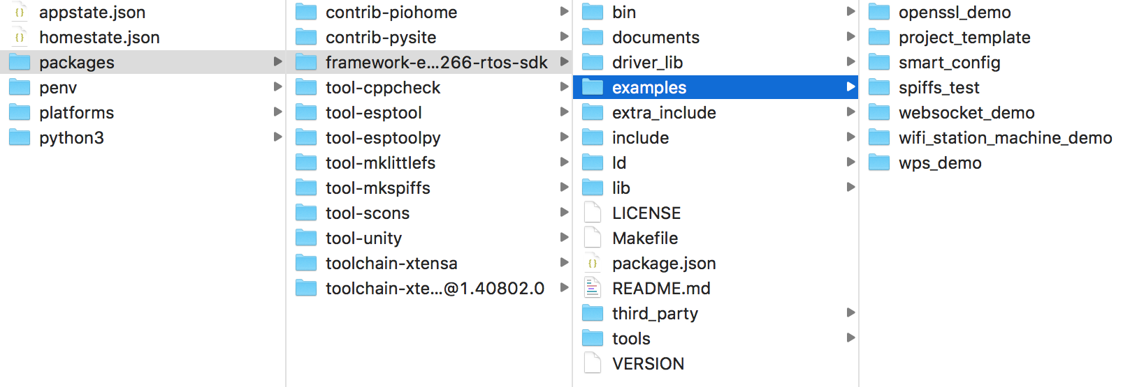 - framework-esp8266-rtos-sdk:RTOS SDK 框架文件,位于 ~/.platformio/packages/framework-esp8266-rtos-sdk 目录