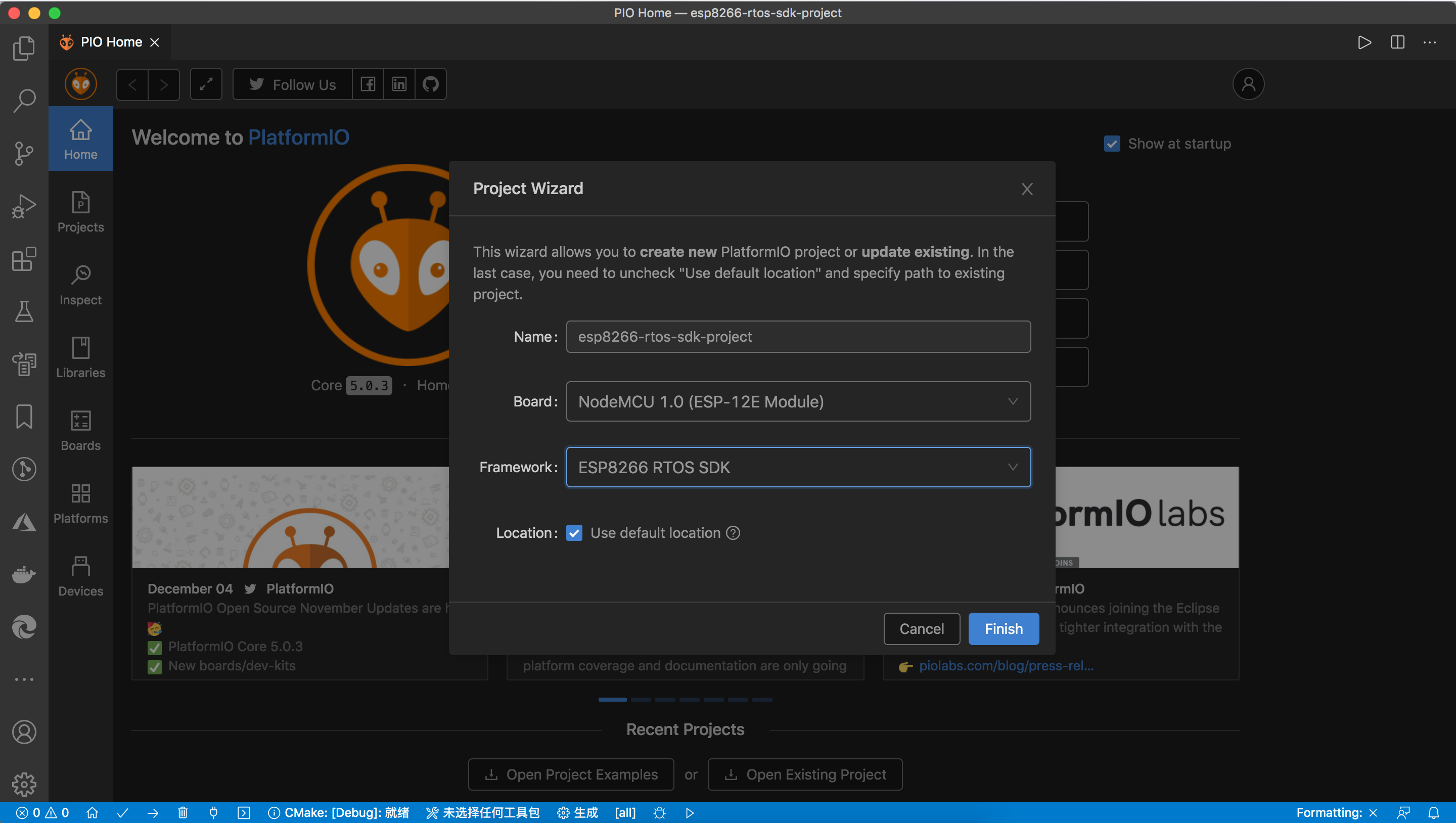这里我以 NodeMCU 1.0 开发板选择 ESP8266 RTOS SDK 框架为例加以说明。