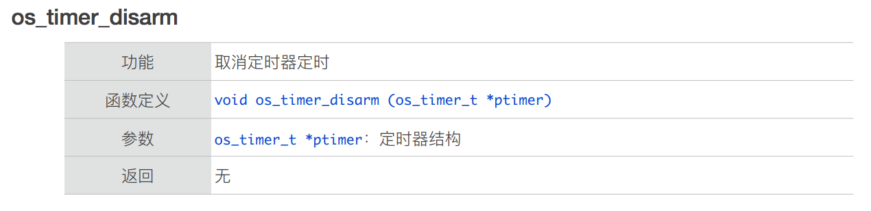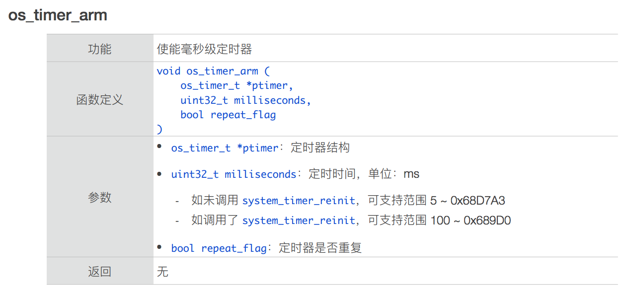 - 对于同⼀个 timer,os_timer_arm 或 os_timer_arm_us 不能重复调⽤,必须先 os_timer_disarm;