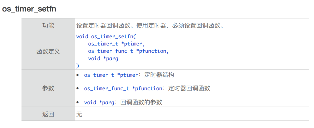 - os_timer_setfn 必须在 timer 未使能的情况下调⽤,在 os_timer_arm 或 os_timer_arm_us 之前或者 os_timer_disarm 之后。