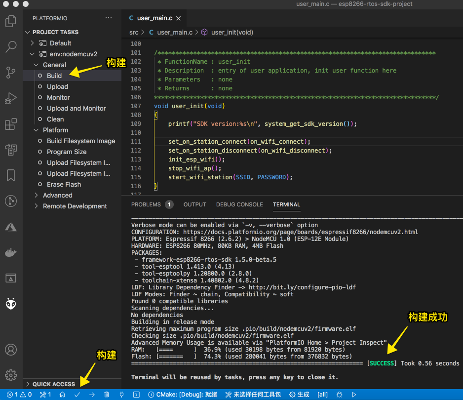 我们从 wifi_station_machine_demo 中将 user/user_main.c 和 user/wifi_state_machine.c 拷贝到工程的 src 目录下,将 include/user_config.h 和 include/wifi_state_machine.h 拷贝到 include 目录下。修改 include/user_config.h 中的 SSID 和 PASSWORD,并修改 platformio.ini 配置文件。