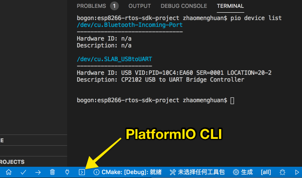 打开 PlatformIO CLI,输入 pio device list 命令可以获取连接的串口信息。