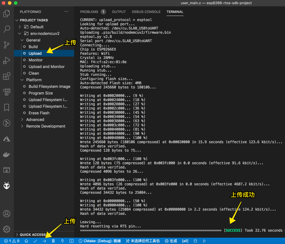 上传的过程就是将编译产物(也称固件)上传到我们的开发板上。