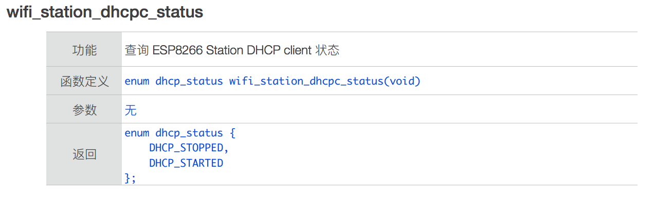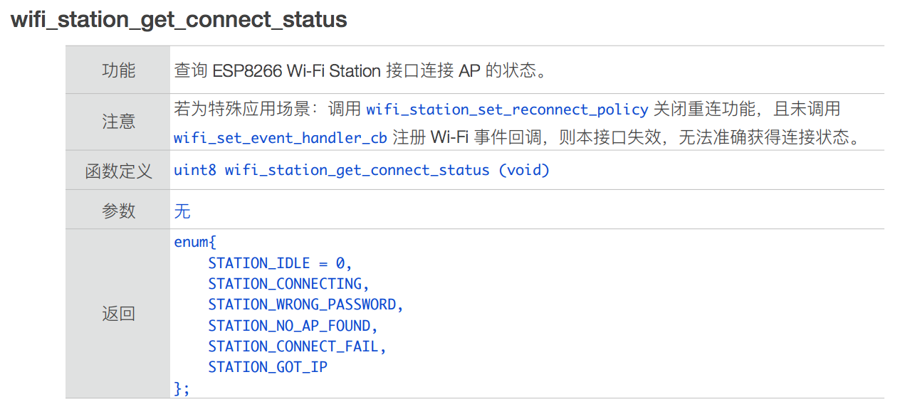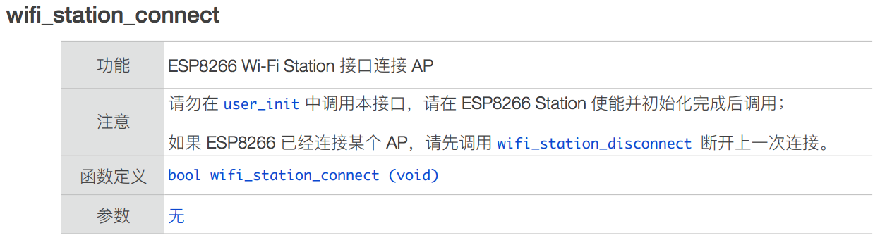}我们可以看到 user_init 中代码逻辑非常简单清晰,除了 system_get_sdk_version 是 SDK 的 API,其他都是 wifi_state_machine.c 驱动中定义的方法。上面的代码开启了 ESP8266 的 Station 模式,从而可以通过路由连接互联网。
