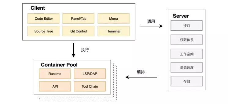 Cloud IDE 主要包含 Client、Server、Container Pool 三部分。