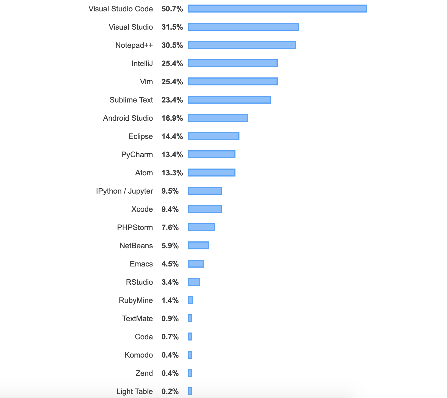 根据 Stack Overflow 2019 年 Developer Survey Results 中流行的开发者工具排行榜,VS Code 无疑是最流行的开发者工具。
