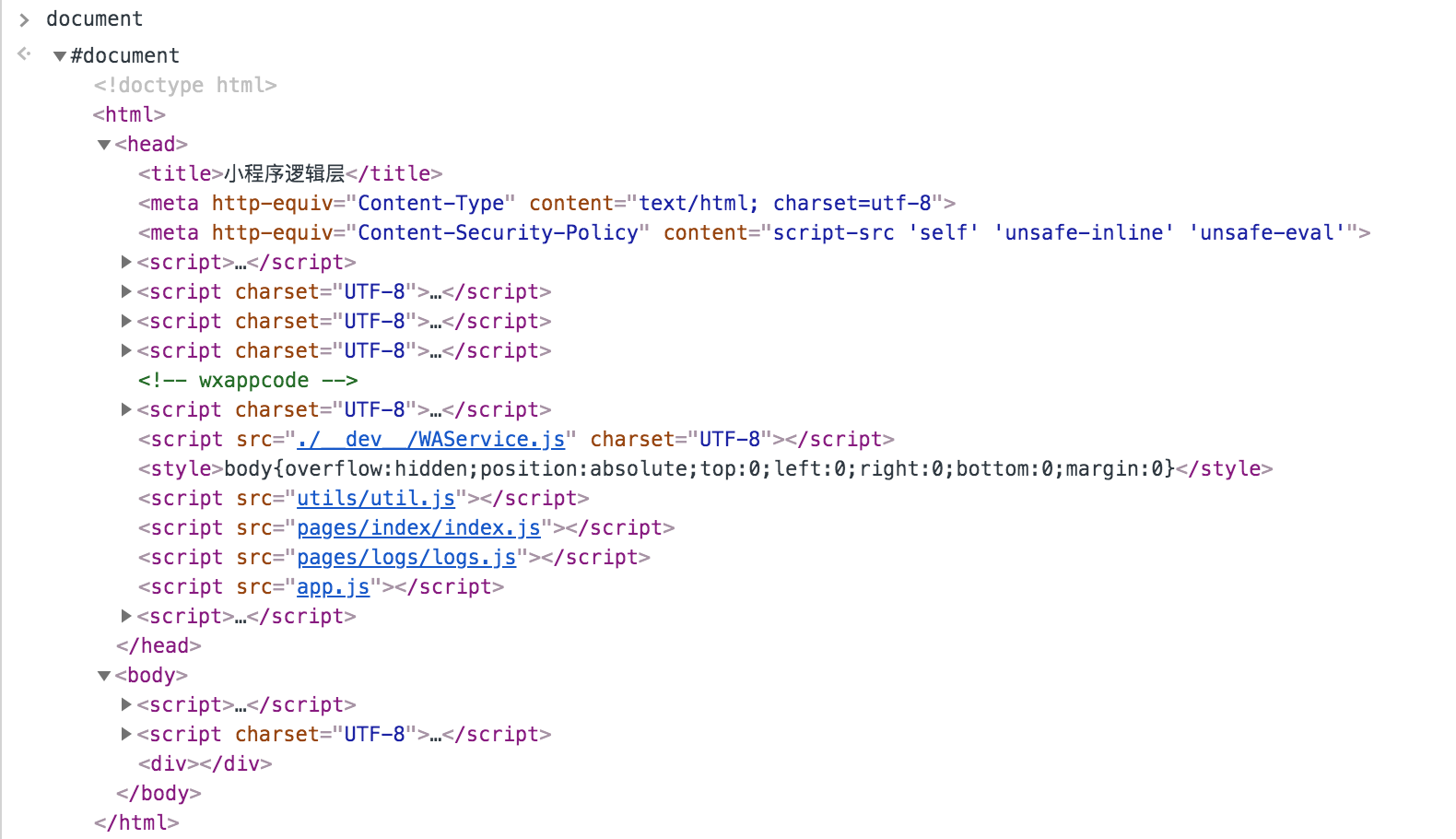 在微信开发者工具中,Workbench 的 DevTools 调试器默认与模拟器逻辑层连接,所以 DevTools 中的 Console 面板进行输入 JS 脚本,JS 脚本实际的执行环境是逻辑层的 JS Context,对于逻辑层的调试,可以直接在调试器中进行。编译运行你的小程序项目,然后打开控制台,输入 document 并回车,就可以看到小程序逻辑层 WebView,如下图: