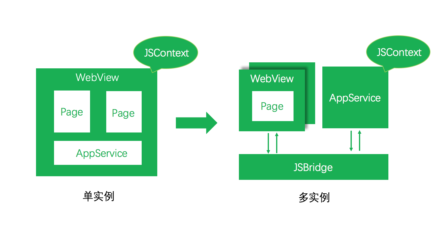 单 WebView 模式下,Page 视图与 App 逻辑共享同一个 JSContext,这样所有的页面可以共享全局的数据和方法,能够实现全局的状态管理。多 WebView 模式下,每一个 WebView 都有一个独立的 JSContext,虽然可以通过窗口通信实现数据传递,但是无法共享数据和方法,对于全局的状态管理也相对比较复杂,抽离一个通用的 WebView 或者 JS Engine 作为应用的 JSContext 就可以解决这些问题,但是同时引入了其他问题:视图和逻辑如何通信,在小程序里面数据更新后视图是异步更新的。