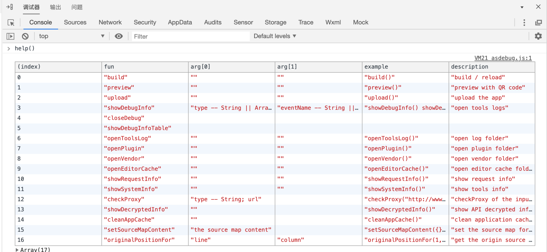 在开发者工具中使用 help() 方法,可以查看一些指令和方法。