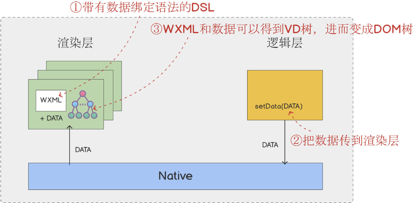 为了管控和安全,微信小程序阻止开发者使用一些浏览器提供的,诸如跳转页面、操作 DOM、动态执行脚本的开放性接口。将逻辑层与视图层进行分离,视图层和逻辑层之间只有数据的通信,可以防止开发者随意操作界面,更好的保证了用户数据安全。
