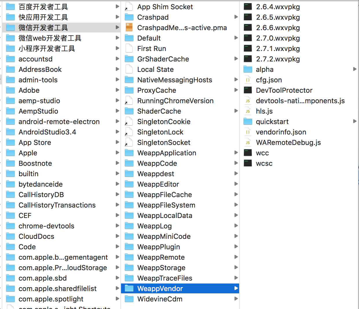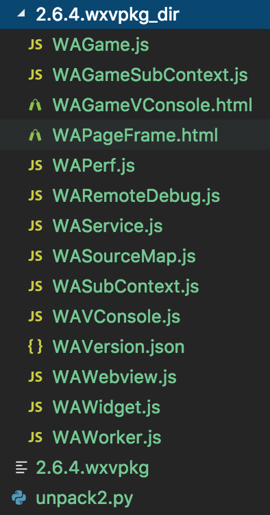 我们可以看到有 wcc、wcsc,小程序各版本的基础库包 .wxvpkg。.wxvpkg 文件可以使用 wechat-app-unpack 解开,解开后里面就是 WAService.js 和 WAWebView.js 等代码。