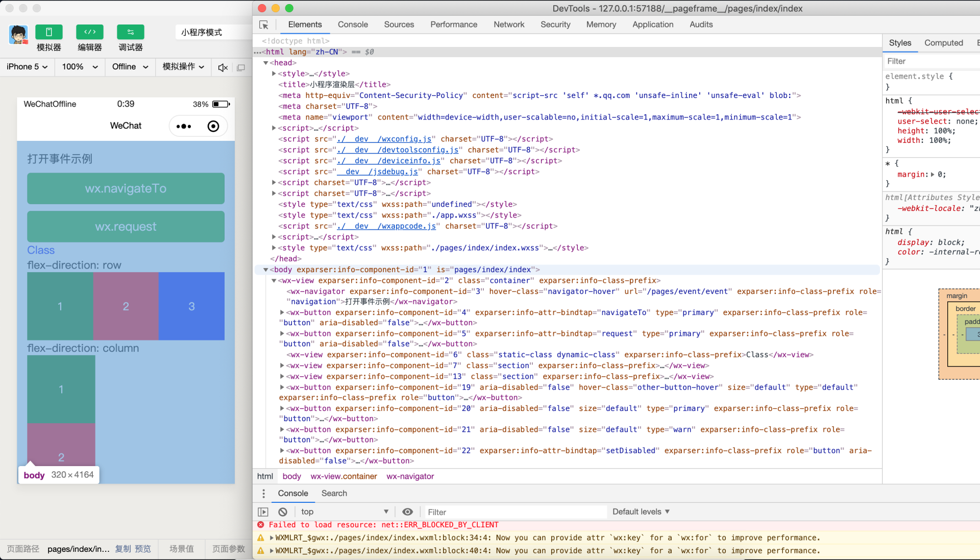微信开发者工具是基于 NW.js 构建,主要由工具栏、模拟器、编辑器、调试器四大部分组成。通过 微信开发者工具 => 调试 => 调试微信微信开发者工具 可以打开小程序 IDE DevTools 面板。通过 DevTools 审查我们可以发现模拟器是通过 WebView 展示页面。微信小程序是双线程的设计,所以存在视图层和逻辑层两个 WebView。